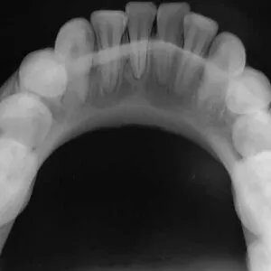 An occlusal x-ray is larger than a usual x-ray. This kind of x-ray highlights tooth development and placement of teeth in children and shows the full arch in either the upper or lower jaw.